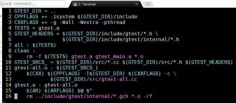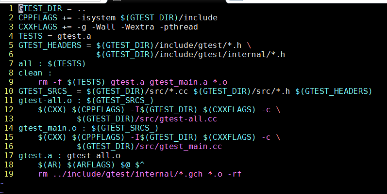 xxxxxxxxxxGTEST_DIR = ..CPPFLAGS += -isystem $(GTEST_DIR)/includeCXXFLAGS += -g -Wall -Wextra -pthreadTESTS = gtest.aGTEST_HEADERS = $(GTEST_DIR)/include/gtest/*.h \ $(GTEST_DIR)/include/gtest/internal/*.hall : $(TESTS)clean : rm -f $(TESTS) gtest.a gtest_main.a *.oGTEST_SRCS_ = $(GTEST_DIR)/src/*.cc $(GTEST_DIR)/src/*.h $(GTEST_HEADERS)gtest-all.o : $(GTEST_SRCS_) $(CXX) $(CPPFLAGS) -I$(GTEST_DIR) $(CXXFLAGS) -c \ $(GTEST_DIR)/src/gtest-all.ccgtest.a : gtest-all.o $(AR) $(ARFLAGS) $@ $^ rm ../include/gtest/internal/*.gch *.o -rf