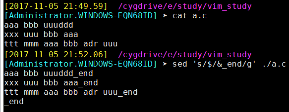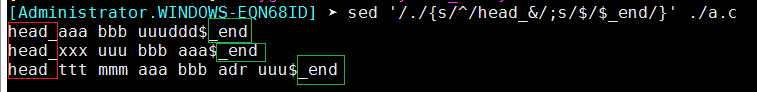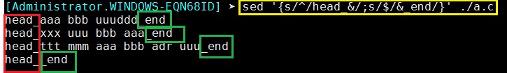 sed '{s/^/head_&/;s/$/$_end/}' ./a.c,屁股后面却多出一行