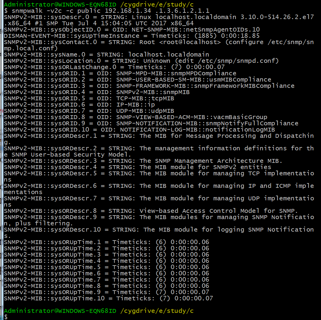 xxxxxxxxxxroot@localhost net-snmp]# /usr/sbin/snmpd[root@localhost net-snmp]# ps -ef | grep snmpdroot 29059 1 0 23:01 ? 00:00:00 /usr/sbin/snmpdroot 29070 19318 0 23:02 pts/2 00:00:00 grep --color=auto snmpd[root@localhost net-snmp]#然后在 cygwin 里面获取 centos 中的 mib 量