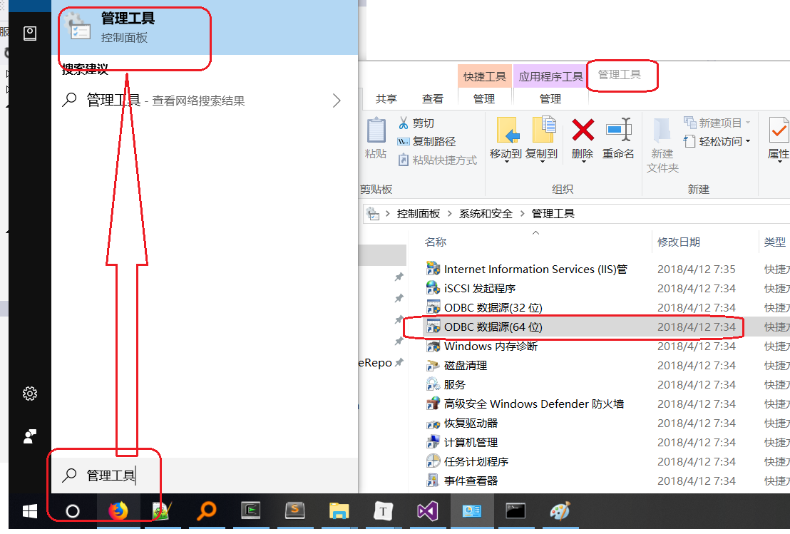win10=>cortana=>管理工具=>ODBC数据源(64位)=>