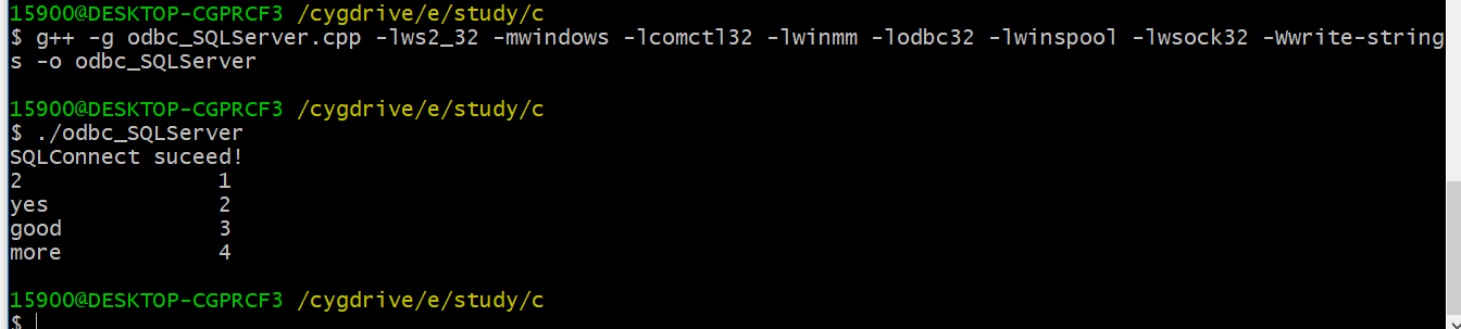 x15900@DESKTOP-CGPRCF3 /cygdrive/e/study/c$ g++ -g odbc_SQLServer.cpp -lws2_32 -mwindows -lcomctl32 -lwinmm -lodbc32 -lwinspool -lwsock32 -Wwrite-strings -o odbc_SQLServer15900@DESKTOP-CGPRCF3 /cygdrive/e/study/c$ ./odbc_SQLServerSQLConnect suceed!2 1yes 2good 3more 4