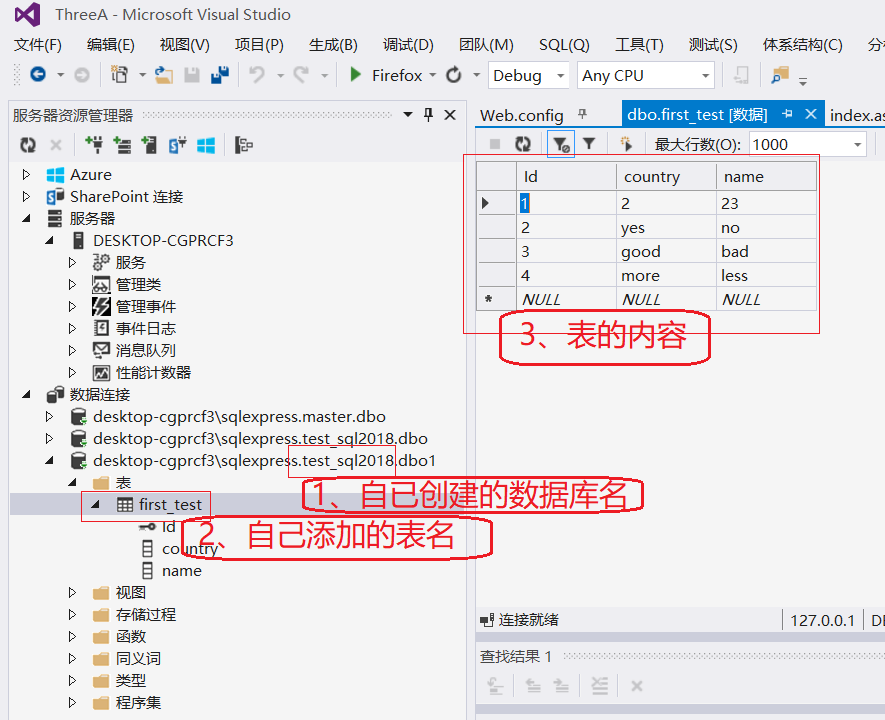 数据库安装好后,新建数据库 test_sql2008,并在该数据库中增加新表 first_test