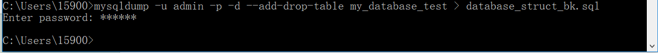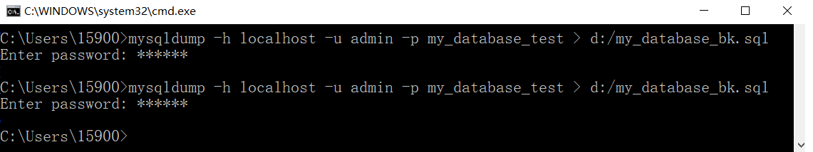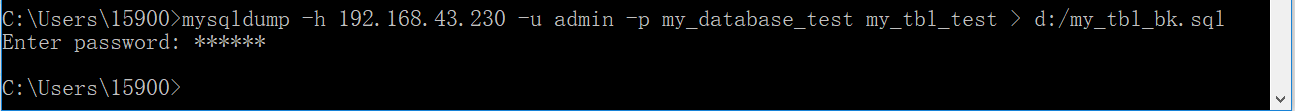 xxxxxxxxxxC:\Users\15900>mysqldump -h 192.168.43.230 -u admin -p my_database_test > d:/my_database_bk2.sqlEnter password: ******同样生成了目标文件。