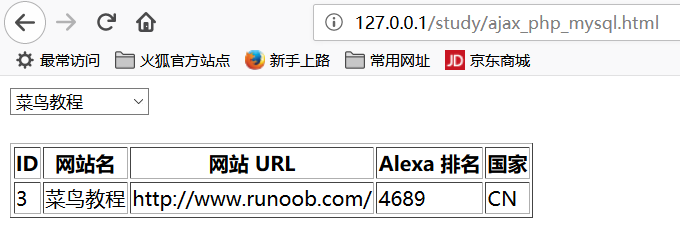 xxxxxxxxxx $q = isset($_GET["q"]) ? intval($_GET["q"]) : ''; if(empty($q)) { echo '请选择一个网站'; exit; } $con = mysqli_connect('127.0.0.1','admin','123456'); if (!$con) { die('Could not connect: ' . mysqli_error($con)); } // 选择数据库 mysqli_select_db($con,"mydb"); // 设置编码,防止中文乱码 mysqli_set_charset($con, "utf8"); $sql="SELECT * FROM Websites WHERE id = '".$q."'"; $result = mysqli_query($con,$sql); echo "<table border='1'> <tr> <th>ID</th> <th>网站名</th> <th>网站 URL</th> <th>Alexa 排名</th> <th>国家</th> </tr>"; while($row = mysqli_fetch_array($result)) { echo "<tr>"; echo "<td>" . $row['id'] . "</td>"; echo "<td>" . $row['name'] . "</td>"; echo "<td>" . $row['url'] . "</td>"; echo "<td>" . $row['alexa'] . "</td>"; echo "<td>" . $row['country'] . "</td>"; echo "</tr>"; } echo "</table>"; mysqli_close($con);运行效果: