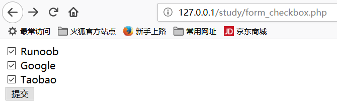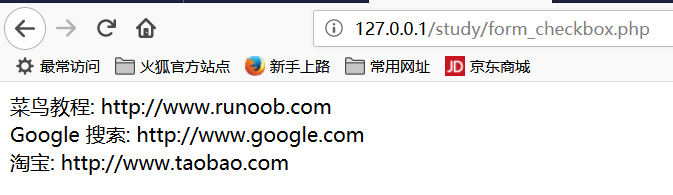 xxxxxxxxxx$q = isset($_POST['q'])? $_POST['q'] : '';if(is_array($q)) { $sites = array( 'RUNOOB' => '菜鸟教程: http://www.runoob.com', 'GOOGLE' => 'Google 搜索: http://www.google.com', 'TAOBAO' => '淘宝: http://www.taobao.com', ); foreach($q as $val) { // PHP_EOL 为常量,用于换行 echo $sites[$val] . PHP_EOL .'<br/>'; } } else {<form action="" method="post"> <input type="checkbox" name="q[]" value="RUNOOB"> Runoob<br> <input type="checkbox" name="q[]" value="GOOGLE"> Google<br> <input type="checkbox" name="q[]" value="TAOBAO"> Taobao<br> <input type="submit" value="提交"></form>}