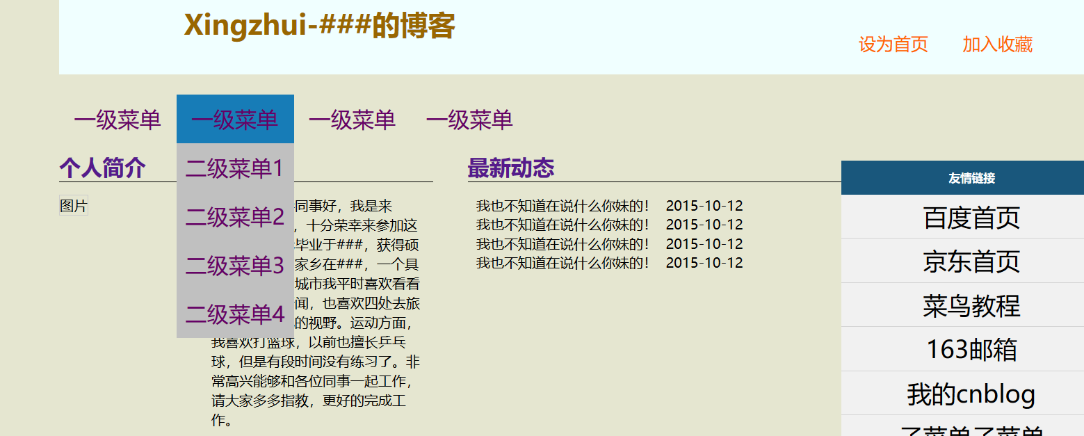 xxxxxxxxxx*{ margin:0px; padding:0px;}body{ background:#e5e6d0;}#header,#menu,#banner,#main,#footer{ margin:0px auto; width:1200px;}#header{ height:100px; background:#F0FFFF;}#header h1{ float:left; margin-top:20px;}#header h1 a{ /*margin:0px auto;可以使元素居中显示*/ width:600px; height:100px; display:block; color:#996600; text-align:center; text-decoration:none;}#header ul{ float:left; padding:50px 0px 0px 300px; list-style:none;}#header ul li{ float:left; padding:0px 20px;}#header ul li a{ color:#ff6600; text-decoration:none; font-size:20px;}#header ul li a:hover{ color:#000; text-decoration:underline;}/* 万能的清除*/.clear{ clear:both;}#menu{ padding-top:3px;}#menu ul{ list-style:none;}#menu ul li{ float:left;}#menu ul li a{ color:#660066; text-decoration:none; text-align:center; display:block;/*这句使center起作用*/ width:135px; height:56px; line-height:56px; font-size:25px;}#menu ul li a:hover{ background:#177cb7;}#menu ul li ul{ display:none; width:135px; position:absolute; background:#C0c0c0;}#menu ul li:hover ul{ display:block;}#menu ul li ul li{ width:135px;}#menu ul li ul li a{ width:135px;}#menu ul li ul li a:hover{ background:#BBFFFF;}#main{ padding:10px 10px;}#main .container{ width:900px; float:left;}#main .container dl{ width:430px; float:left;}#main .container dl h5,#main .product h5{ border-bottom:1px solid #000; margin-bottom:15px; font-size:25px;}#main .container dl h5 a{ margin:0 auto; text-decoration:none;}#main .container dl dt{ float:left; width:150px;}#main .container dl dt img{ border:1px solid #ccc; width:150px; height:250px;}#main .container dl.xuexiao{ margin-right:40px;}#main .container dl.xuexiao dd{ font-size:16px; margin-left:25px; float:left; width:240px; text-indent:2em;/*首行缩进*/}#main .container dl.xinwen dd{ height:22px; line-height:22px; background:none;}#main .container dl.xinwen dd a{ color:#000000; text-decoration:none; padding-left:10px;}#main .container dl.xinwen dd span{ padding-left:10px;}#main .product{ padding-top:20px;}#main .product h5 a{ margin:0px auto; text-decoration:none;}#main .product ul li{ float:left; padding-left:10px; list-style:none;}#main .product ul li a{ text-decoration:none;}#main .subMenu{ width:300px; float:left; margin:10px 0px;}#main .subMenu h5{ background:#19577c; height:39px; text-align:center; color:#fff; line-height:39px;}#main .subMenu ul li{ border-bottom:1px solid #d4d4d4; background:#f1f1f1; list-style:none;}#main .subMenu ul li a{ display:block; text-align:center; color:#000; text-decoration:none; background:none; height:50px; line-height:50px; font-size:28px;}#main .subMenu ul li a:hover{ color:#177cb7; background:none;}#footer{ background:#d1dce3; height:50px; line-height:50px; font-size:25px; text-align:center;}xxxxxxxxxx<html><head><meta http-equiv="Content-Type" content="text/html; charset=utf-8"><title>博客首页</title><link rel="stylesheet" type="text/css" href="mycss.css"> </head><body> <div id="header"> <h1><a href="#">Xingzhui-###的博客</a></h1> <ul> <li><a href="#">设为首页</a></li> <li><a href="#">加入收藏</a></li> </ul> </div> <div id="menu" class="clear"> <ul> <li><a href="#">一级菜单</a></li> <li><a href="#">一级菜单</a> <ul> <li><a href="#">二级菜单1</a></li> <li><a href="#">二级菜单2</a></li> <li><a href="#">二级菜单3</a></li> <li><a href="#">二级菜单4</a></li> </ul> </li> <li><a href="#">一级菜单</a> <ul> <li><a href="#">二级菜单1</a></li> <li><a href="#">二级菜单2</a></li> <li><a href="#">二级菜单3</a></li> <li><a href="#">二级菜单4</a></li> </ul> </li> <li><a href="#">一级菜单</a></li> </ul> </div> <div id="main" class="clear"> <div class="container"> <div class="news"> <dl class="xuexiao"> <h5><a href="#">个人简介</a></h5> <dt><img src="mypic.jpg" alt="图片"></dt> <dd>各位领导同事好,我是来自###的###, 十分荣幸来参加这次见面会。我毕业于###, 获得硕士学位。我的家乡在###,一个具有悠久历史的城市 我平时喜欢看看小说,浏览新闻,也喜欢四处去旅游, 开阔自己的视野。运动方面,我喜欢打篮球,以前也擅长乒乓球, 但是有段时间没有练习了。非常高兴能够和各位同事一起工作, 请大家多多指教,更好的完成工作。</dd> </dl> <dl class="xinwen"> <h5><a href="#">最新动态</a></h5> <dd> <a href="#">我也不知道在说什么你妹的!</a><span>2015-10-12</span> </dd> <dd> <a href="#">我也不知道在说什么你妹的!</a><span>2015-10-12</span> </dd> <dd> <a href="#">我也不知道在说什么你妹的!</a><span>2015-10-12</span> </dd> <dd> <a href="#">我也不知道在说什么你妹的!</a><span>2015-10-12</span> </dd> </dl> </div> <div class="product clear"> <h5><a href="#">精彩教程</a></h5> <ul> <li><a href="#">这里要设置连接!</a></li> <li><a href="#">这里要设置连接!</a></li> <li><a href="#">这里要设置连接!</a></li> <li><a href="#">这里要设置连接!</a></li> </ul> </div> </div> <div class="subMenu"> <h5>友情链接</h5> <ul> <li><a href="http://www.baidu.com" target="_blank">百度首页</a></li> <li><a href="http://www.jd.com">京东首页</a></li> <li><a href="http://www.runoob.com/">菜鸟教程</a></li> <li><a href="http://mail.163.com">163邮箱</a></li> <li><a href="http://www.cnblogs.com/xingzhui/">我的cnblog</a></li> <li><a href="#">子菜单子菜单</a></li> <li><a href="#">子菜单子菜单</a></li> <li><a href="#">子菜单子菜单</a></li> </ul> </div> </div> <div id="footer" class="clear"> <p>联系我:<a href="#">mhzhang1989@163.com</a></p> </div></body></html>