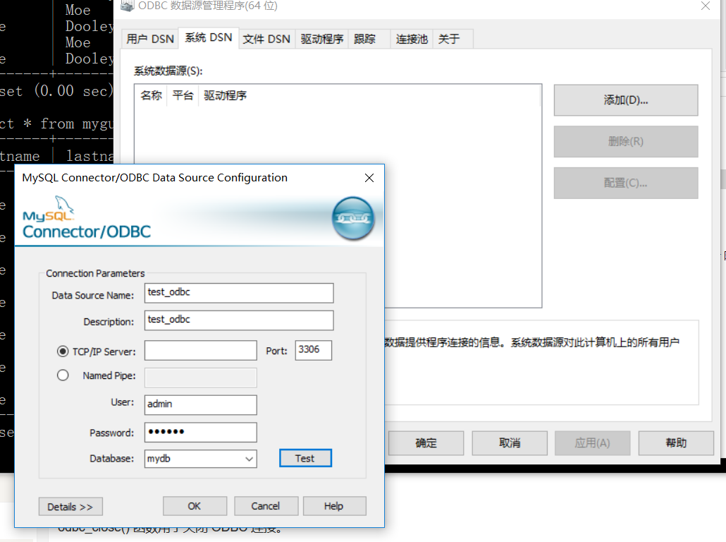 echo 'odbc 连接 mysql 数据库进入测试!<br/>';