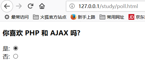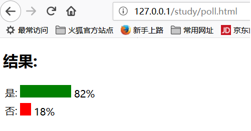 xxxxxxxxxx<html><head><meta charset="utf-8"><title>菜鸟教程(runoob.com)</title><script>function getVote(int) { if (window.XMLHttpRequest) { // IE7+, Firefox, Chrome, Opera, Safari 执行代码 xmlhttp=new XMLHttpRequest(); } else { // IE6, IE5 执行代码 xmlhttp=new ActiveXObject("Microsoft.XMLHTTP"); } xmlhttp.onreadystatechange=function() { if (xmlhttp.readyState==4 && xmlhttp.status==200) { document.getElementById("poll").innerHTML=xmlhttp.responseText; } } xmlhttp.open("GET","poll_vote.php?vote="+int,true); xmlhttp.send();}</script></head><body><div id="poll"><h3>你喜欢 PHP 和 AJAX 吗?</h3><form>是:<input type="radio" name="vote" value="0" onclick="getVote(this.value)"><br>否:<input type="radio" name="vote" value="1" onclick="getVote(this.value)"></form></div></body></html>xxxxxxxxxx<?php$vote = htmlspecialchars($_REQUEST['vote']);// 获取文件中存储的数据$filename = "poll_result.txt";$content = file($filename);// 将数据分割到数组中$array = explode("||", $content[0]);$yes = $array[0];$no = $array[1];if ($vote == 0){ $yes = $yes + 1;}if ($vote == 1){ $no = $no + 1;}// 插入投票数据$insertvote = $yes."||".$no;$fp = fopen($filename,"w");fputs($fp,$insertvote);fclose($fp);?><h2>结果:</h2><table> <tr> <td>是:</td> <td> <span style="display: inline-block; background-color:green; width:<?php echo(100*round($yes/($no+$yes),2)); ?>px; height:20px;" ></span> <?php echo(100*round($yes/($no+$yes),2)); ?>% </td> </tr> <tr> <td>否:</td> <td> <span style="display: inline-block; background-color:red; width:<?php echo(100*round($no/($no+$yes),2)); ?>px; height:20px;"></span> <?php echo(100*round($no/($no+$yes),2)); ?>% </td> </tr></table>代码原来如此简单,效果却十分漂亮: