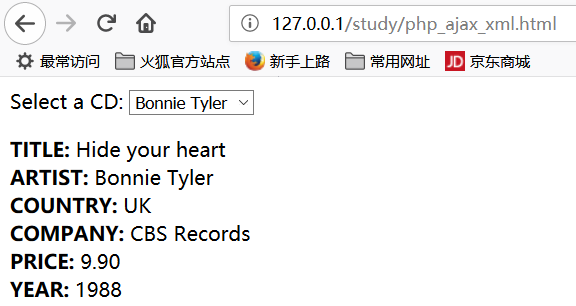 xxxxxxxxxx<?php$q=$_GET["q"];$xmlDoc = new DOMDocument();$xmlDoc->load("cd_catalog.xml");$x=$xmlDoc->getElementsByTagName('ARTIST');for ($i=0; $i<=$x->length-1; $i++){ // 处理元素节点 if ($x->item($i)->nodeType==1) { if ($x->item($i)->childNodes->item(0)->nodeValue == $q) { $y=($x->item($i)->parentNode); } }}$cd=($y->childNodes);for ($i=0;$i<$cd->length;$i++){ // 处理元素节点 if ($cd->item($i)->nodeType==1) { echo("<b>" . $cd->item($i)->nodeName . ":</b> "); echo($cd->item($i)->childNodes->item(0)->nodeValue); echo("<br>"); }}?>实际运行效果: