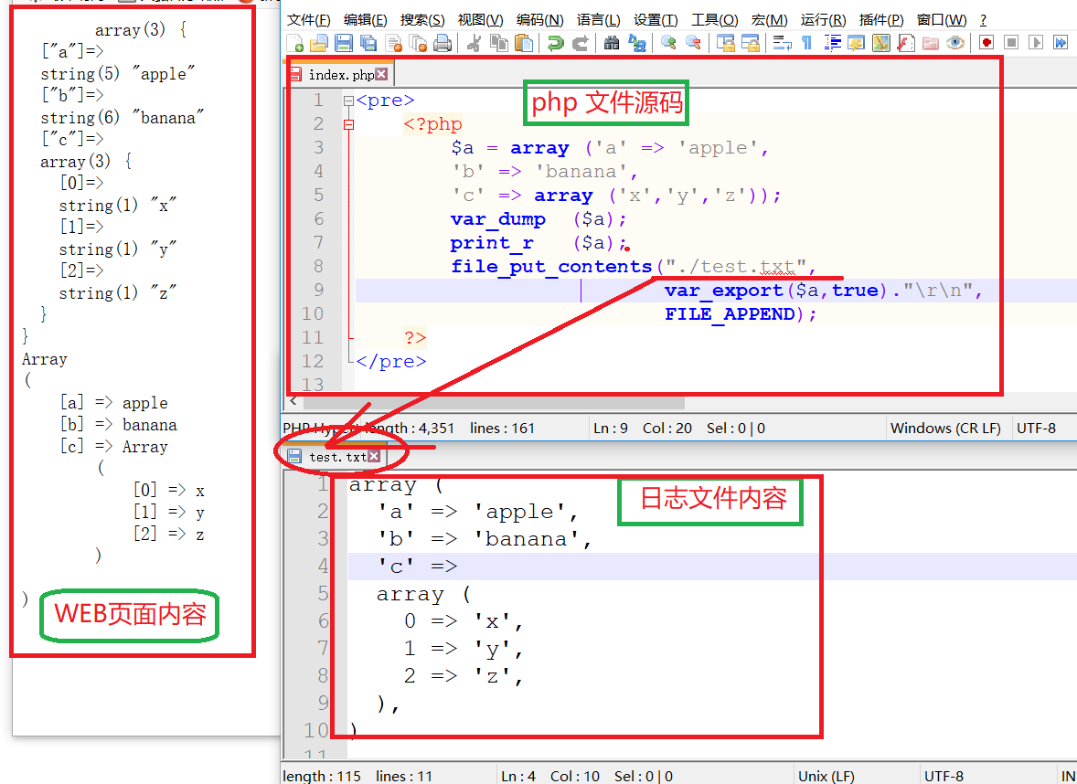 xxxxxxxxxx<?php exit("hello word"); ?><?php die("hello word"); ?>xxxxxxxxxx网页内容:<pre> <?php $a = array ('a' => 'apple', 'b' => 'banana', 'c' => array ('x','y','z')); var_dump ($a); print_r ($a); ?></pre>输出:array(3) { ["a"]=> string(5) "apple" ["b"]=> string(6) "banana" ["c"]=> array(3) { [0]=> string(1) "x" [1]=> string(1) "y" [2]=> string(1) "z" }}Array( [a] => apple [b] => banana [c] => Array ( [0] => x [1] => y [2] => z ))PHP file_put_contents()将内容打印到后台文件中查看