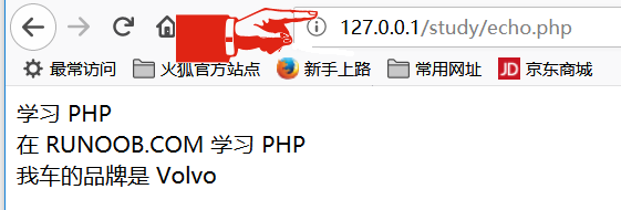 xxxxxxxxxx例2,对上例的改造,代码逻辑更加直观:<html> <body> <!-- 按下‘提交’按钮后,指定处理此命令的脚本为 ./echo.php --> <form method="post" action="./echo.php"> Name: <input type="text" name="fname"> <input type="submit"> </form> </body></html>相应的 ./echo.php 内容:<?php $txt1="学习 PHP"; $txt2="RUNOOB.COM"; $cars=array("Volvo","BMW","Toyota"); print $txt1; print "<br>"; print "在 $txt2 学习 PHP "; print "<br>"; print "我车的品牌是 {$cars[0]}";?>运行效果: