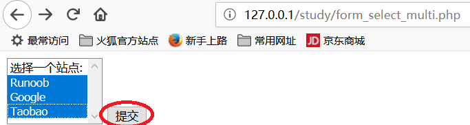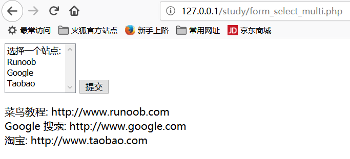 xxxxxxxxxx<form action="" method="post"> <select multiple="multiple" name="q[]"> <option value="">选择一个站点:</option> <option value="RUNOOB">Runoob</option> <option value="GOOGLE">Google</option> <option value="TAOBAO">Taobao</option> </select> <input type="submit" value="提交"></form> $q = isset($_POST['q'])? $_POST['q'] : ''; if(is_array($q)) { $sites = array( 'RUNOOB' => '菜鸟教程: http://www.runoob.com', 'GOOGLE' => 'Google 搜索: http://www.google.com', 'TAOBAO' => '淘宝: http://www.taobao.com', ); foreach($q as $val) { // PHP_EOL 为常量,用于换行 echo $sites[$val] . PHP_EOL.'<br/>'; } } else { }